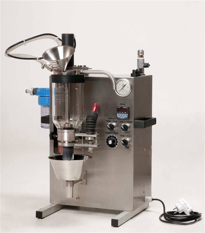 Inside the testing device the pigment or extender to be tested is brought into a circular movement by a water jet rotor which is situated inside the vessel. The fine materials are separated from the coarse materials by the water and the fine particles are flushed through a sieve. The sieve residue is dried and gravimetrically analyzed according to the guidelines. Appropriate sieves (main range ISO 565) must be used according to the different testing guidelines. Furthermore, the recommendations of the DIN EN ISO 787-18 shall be used.